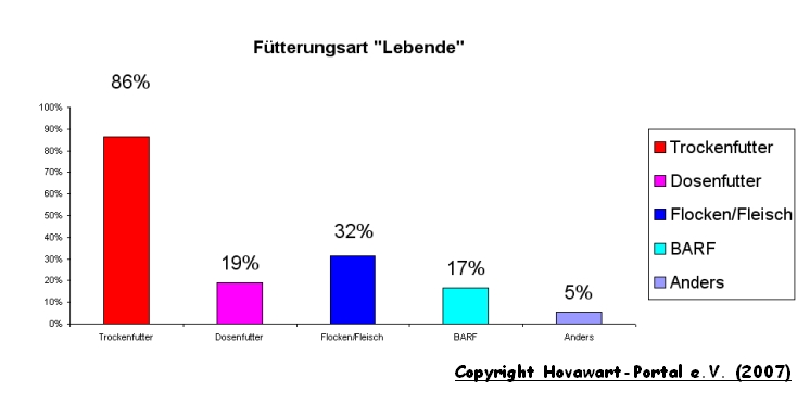Angaben zur Gesundheitsfürsorge und Ernährung Da die Ernährung und die Gesundheitsfürsorge sicherlich auch immer eine Rolle spielt, wie gesund ein Hund ist, haben wir auch einige Fragen zu diesem Themenbereich gestellt. Welche Ernährungsweise nun jedoch die "gesündeste" ist, kann nicht gesagt werden. Trotzdem sollen die Ergebnisse nicht vorenthalten werden. Bei den Angaben zur Ernährung waren wieder Mehrfachnennungen möglich. Denn viele Hunde bekommen z.B. nicht nur Trockenfutter oder nur Dosenfutter.